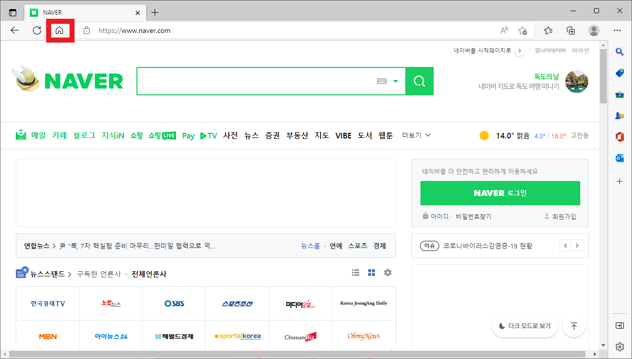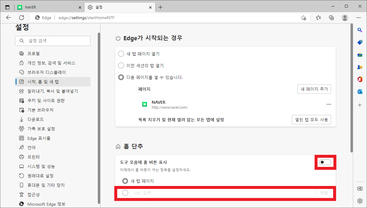 마이크로소프트 엣지 홈버튼 생성 및 설정하기