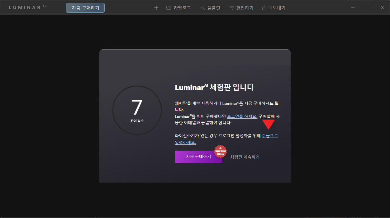 ④ 프로그램을 실행하면 7일 체험판이라는 팝업이 뜨는데요 하지만 우리는 무료배포한 라이센스 활성화 키를 받았으니 아랫부분에 있는 수동으로입력하세요를 눌러줍니다.
